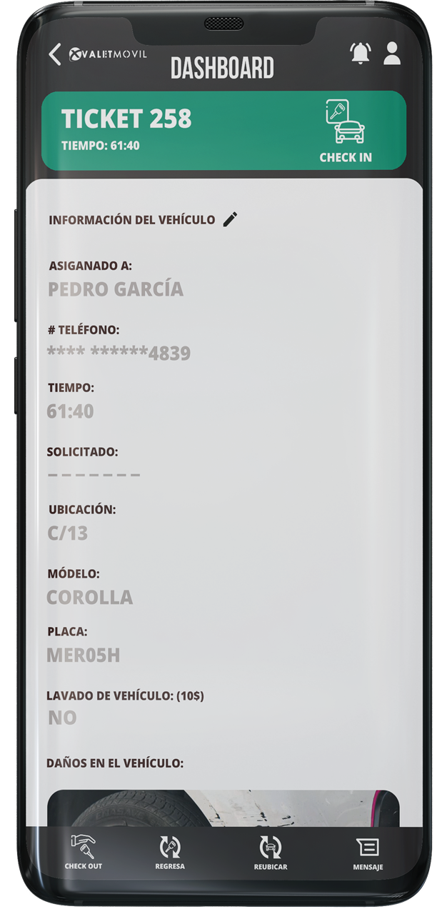 El valet estaciona el vehículo, coloca la etiqueta de identificación en el espejo y la ingresa en la aplicación junto a cualquier otra información.